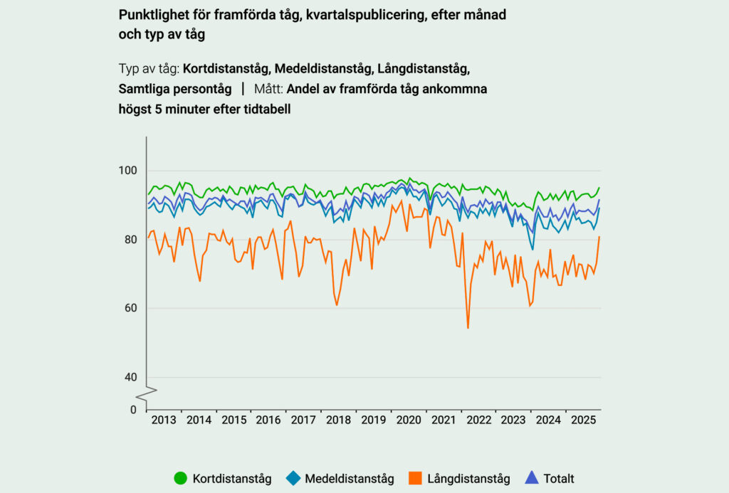 Punktligheten för persontågen förbättrades under 2025 jämfört med 2024 enligt preliminär statistik från Trafikanalys. Men i ett längre perspektiv blev ändå 2025 ett dåligt år för tågtrafiken.