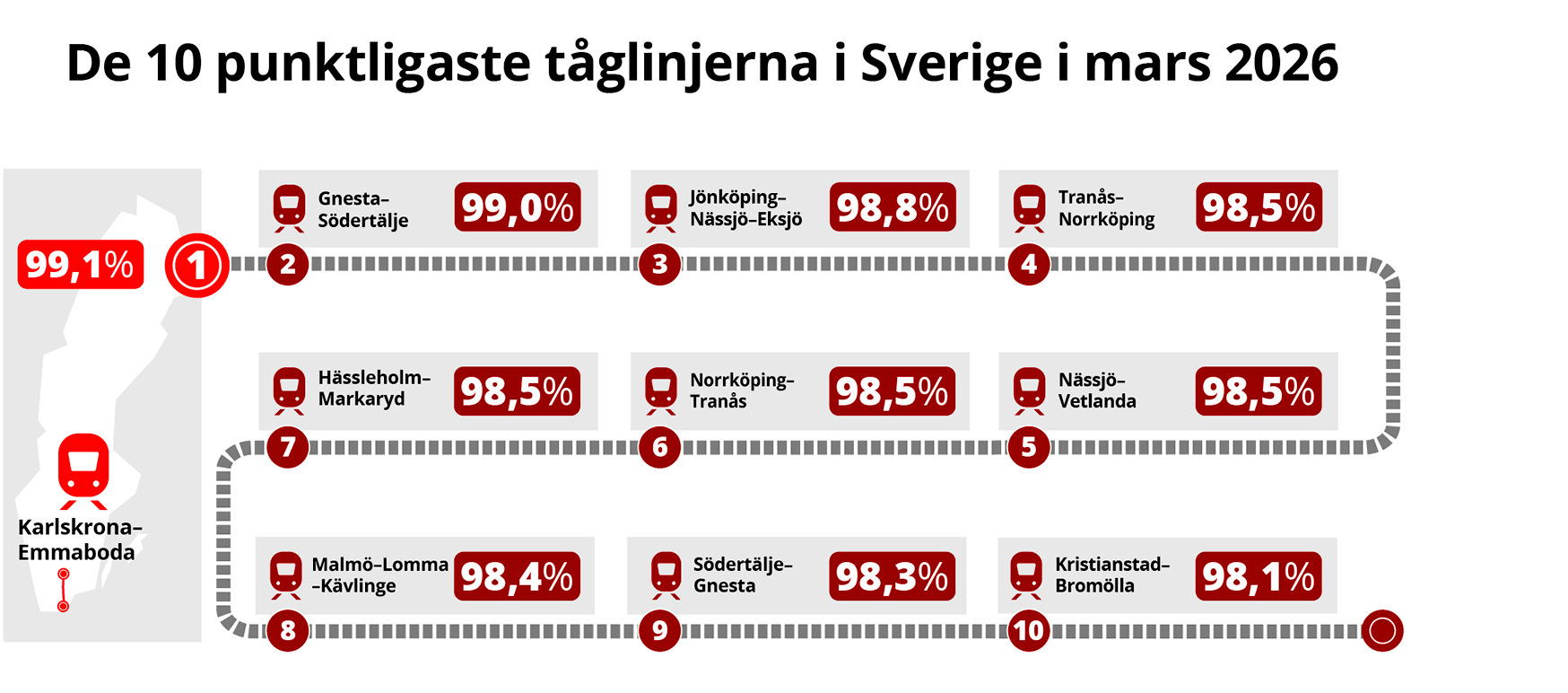 Bortsett från pandemiåren 2020 och 2021 är mars 2026 den bästa marsmånaden punktlighetsmässigt sedan 2019.