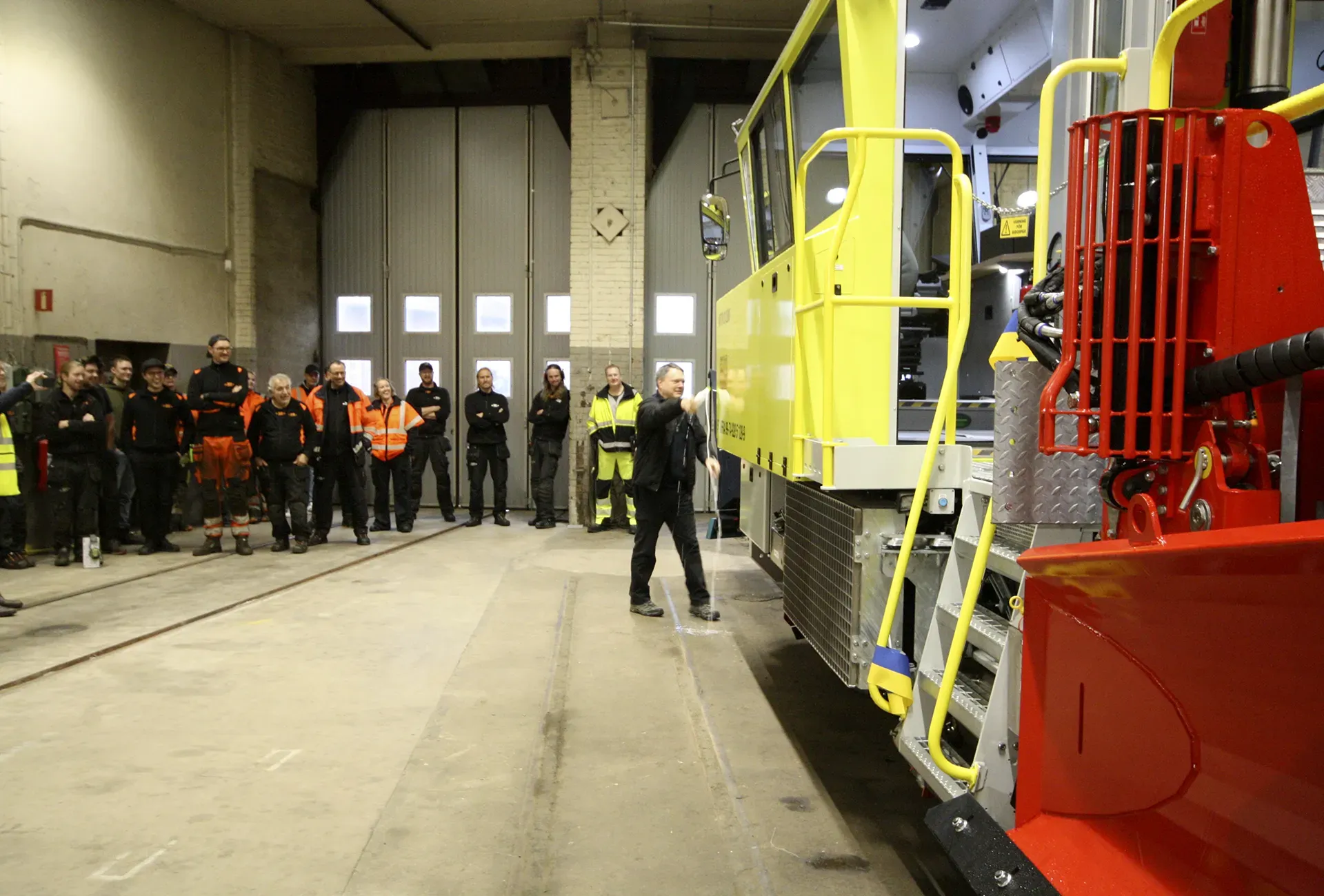 Bjarne Andersson på Infranord, som fått den första trallan uppkallad efter sig, offrade en flaska bubbelvatten över hytten.