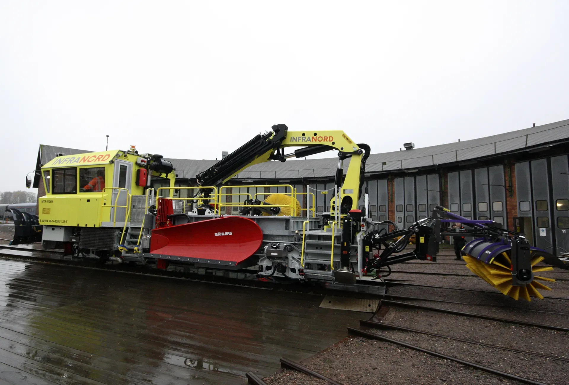 Trallan har försetts med en kraftig borste som klan användas för snösopning och ballastjustering.