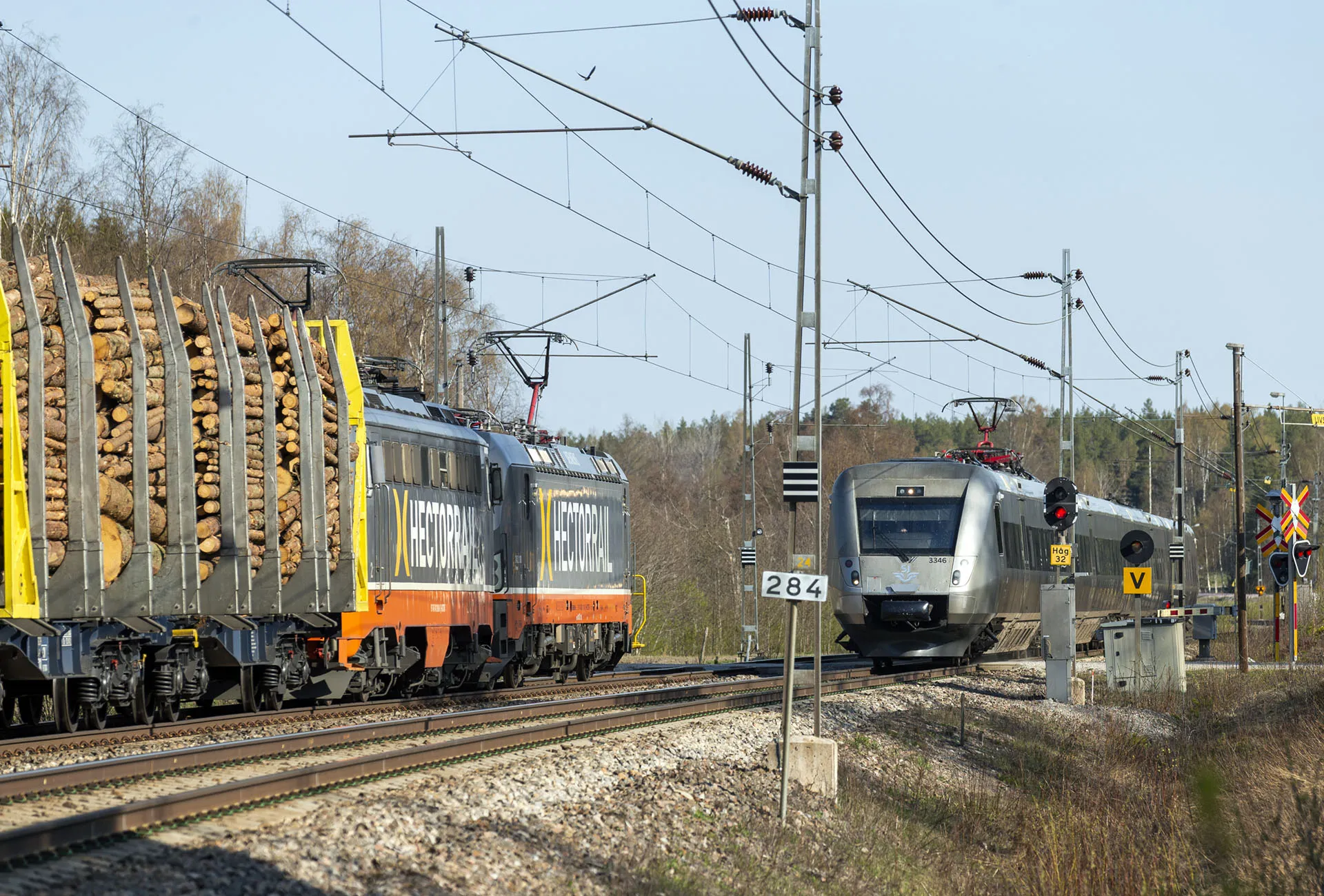 Enkelspåret på Ostkustbanan mellan Gävle och Sundsvall medför begränsad kapacitet och långa res- och transporttider. SJ:s snabbtåg 567 Sundsvall–Stockholm med X55 dundrar genom Harmånger i maj 2021 medan godståg 41512 med massaved från Laxå till Timrå står på sidan.