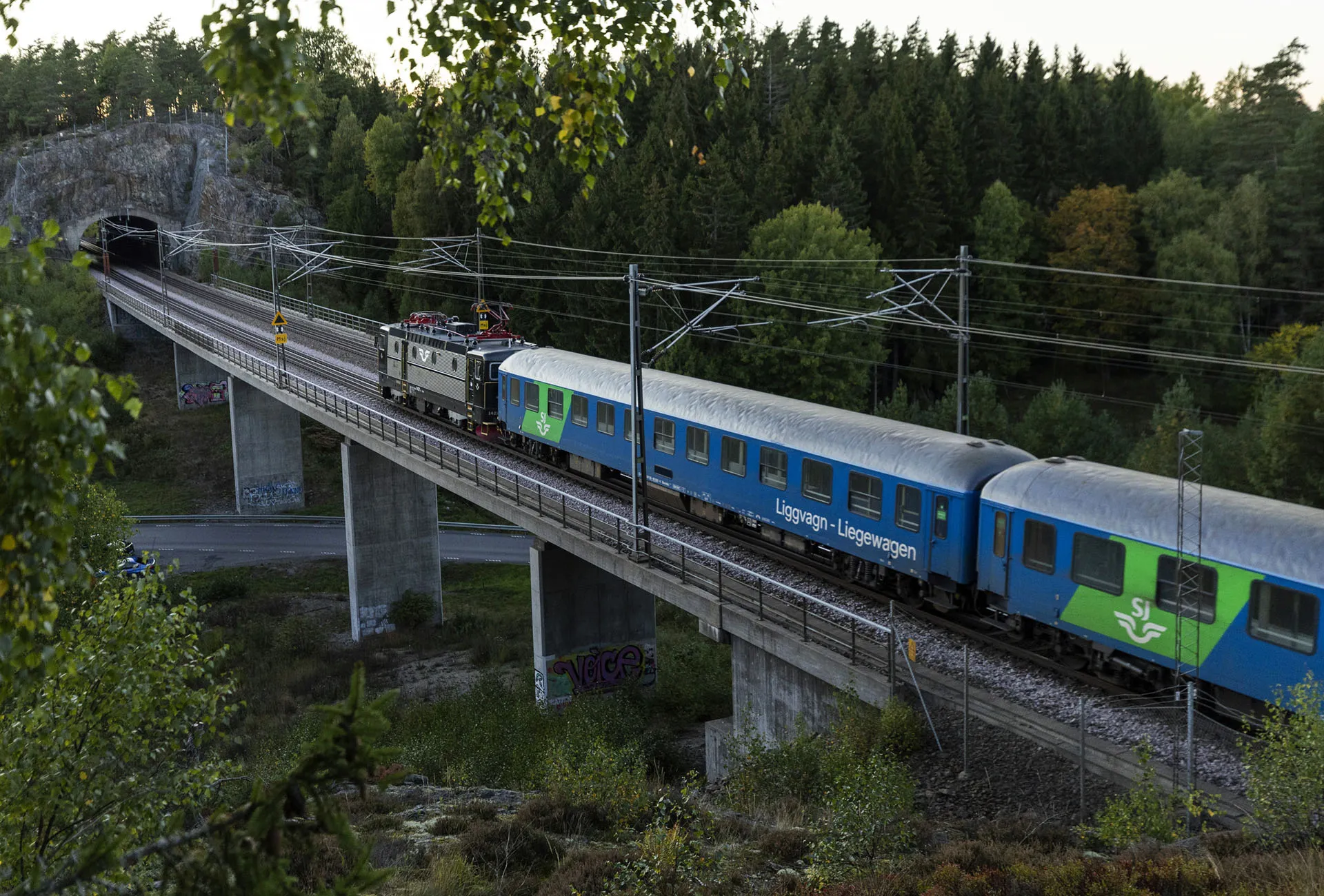 SJ kommer under det närmaste halvåret att köra 20 nattåg från Göteborg till Berlin. En kväll i september 2022 drog Rc6 1421 nattåget från Stockholm söderut på Grödingebanan. FOTO: Kasper Dudzik