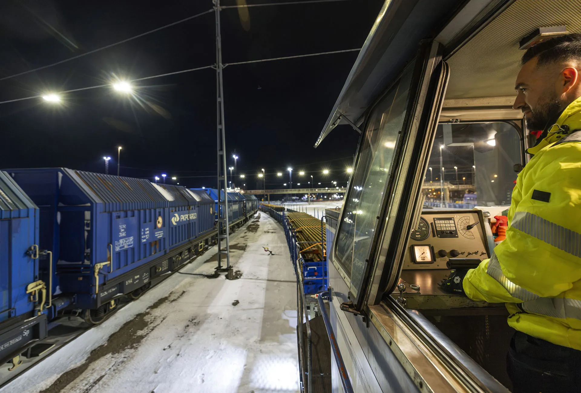 Granit Ramosaj, arbetsledare och lokförare på Väte Rail, drar i land vagnarna med räler från Polen. Till vänster vagnar för ståltransporter mellan Polen och Danmark.