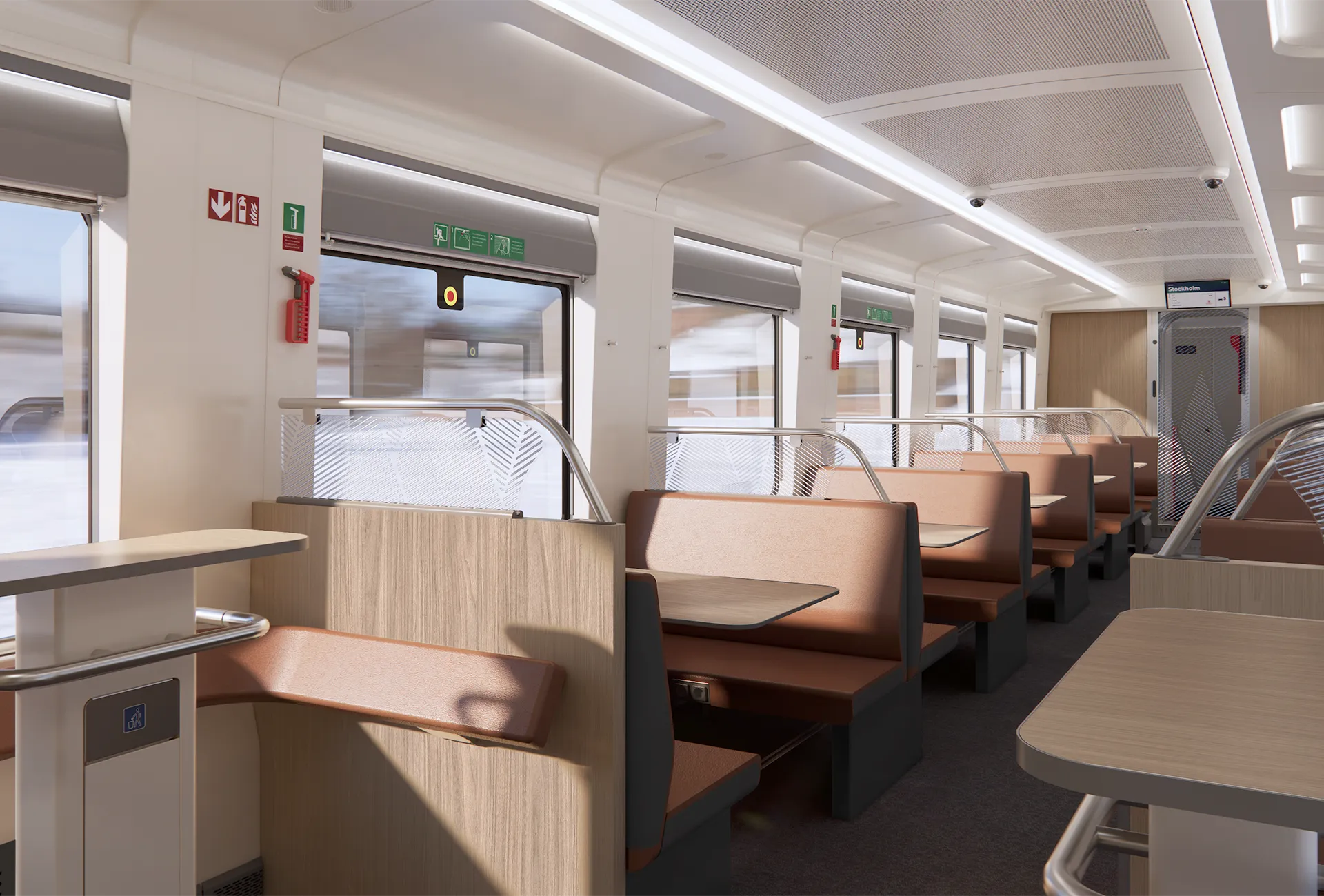 Restaurang- och bistrovagnarna får enligt Trafikverket en lounge-liknande miljö med ljust trä och mörka golv. Sittgrupper för två till fyra personer kombineras med stämningsfull belysning och bordsservering och självbetjäning.