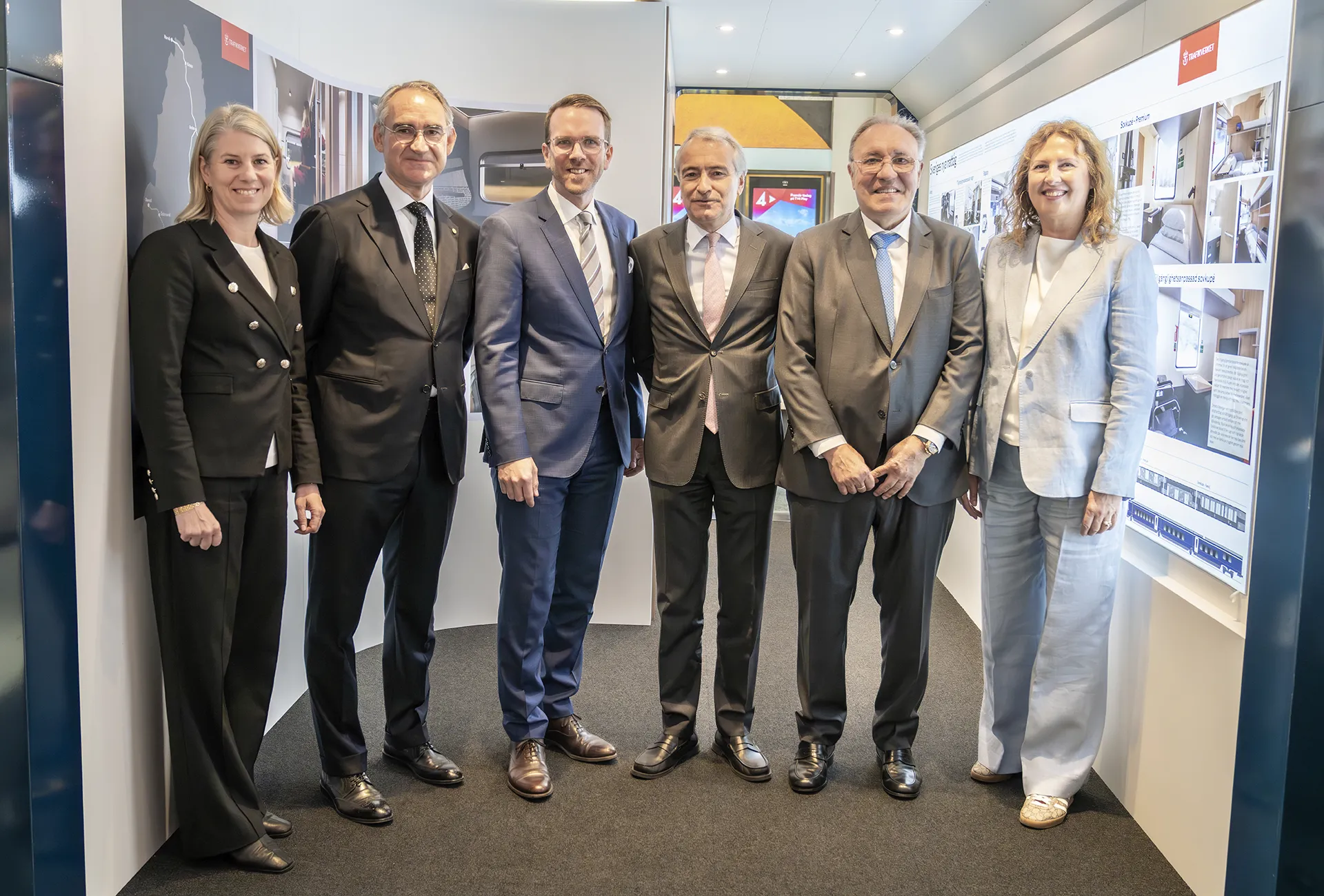Vid måndagens ceremoni på Stockholm C medverkade Cathrine Sandegren kommunikationsdirektör Trafikverket, Roberto Maiorana, generaldirektör Trafikverket, Andreas Carlson, infrastrukturminister, Luís Manuel Cuesta Civís , Spaniens ambassadör i Sverige, José Antonio Jainaga, president Talgo och Biljana Pehrsson, vd Jernhusen. FOTO: Andreas Gärdnert