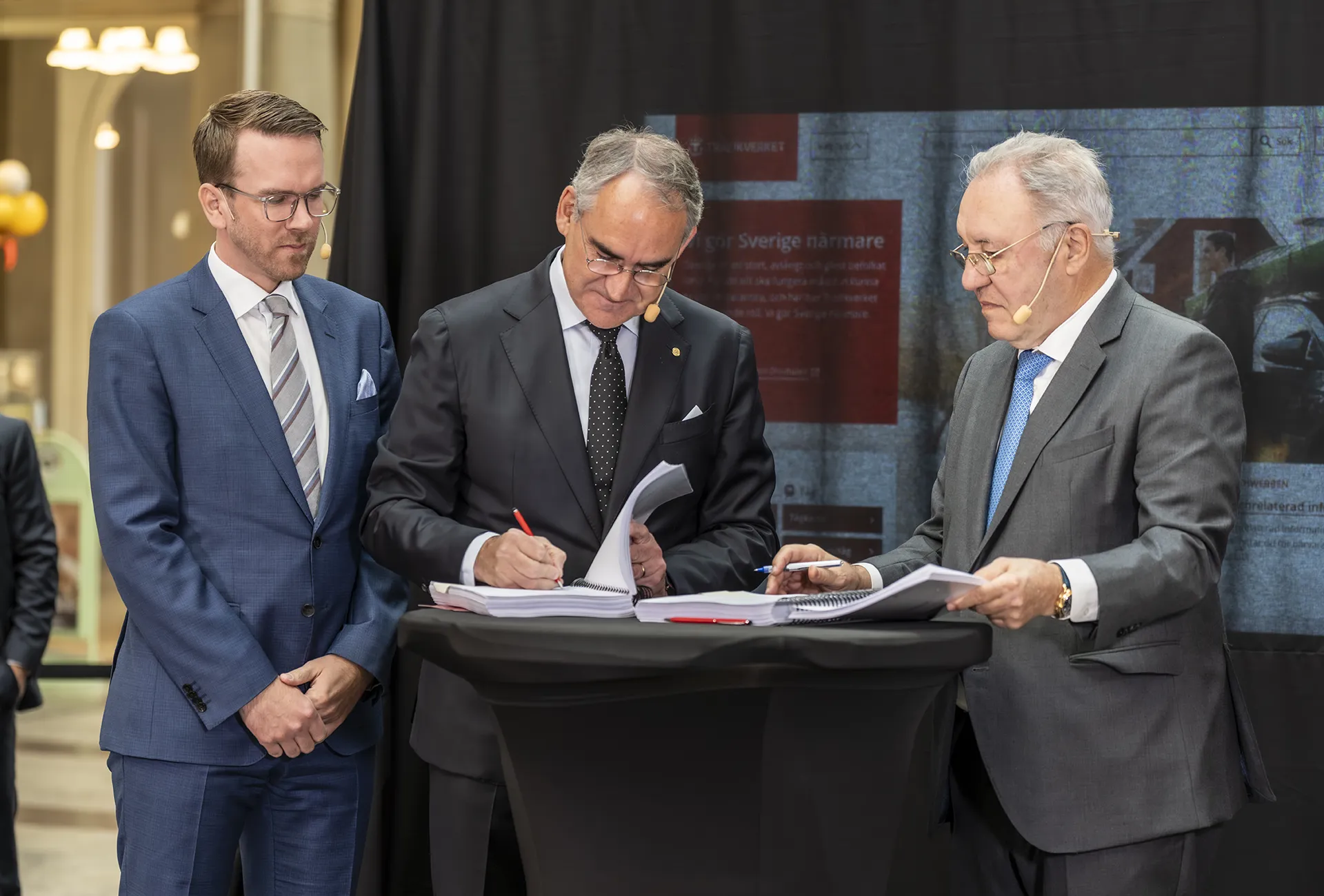Vid måndagens ceremoni på Stockholm C med infrastrukturminister Andreas Carlson, Trafikverkets generaldirektör Roberto Maiorana och styrelseordföranden i Talgo José Antonio Jainaga var budskapet att Trafikverket och Talgo tecknat avtal om leverans av 91 vagnar. FOTO: Andreas Gärdnert